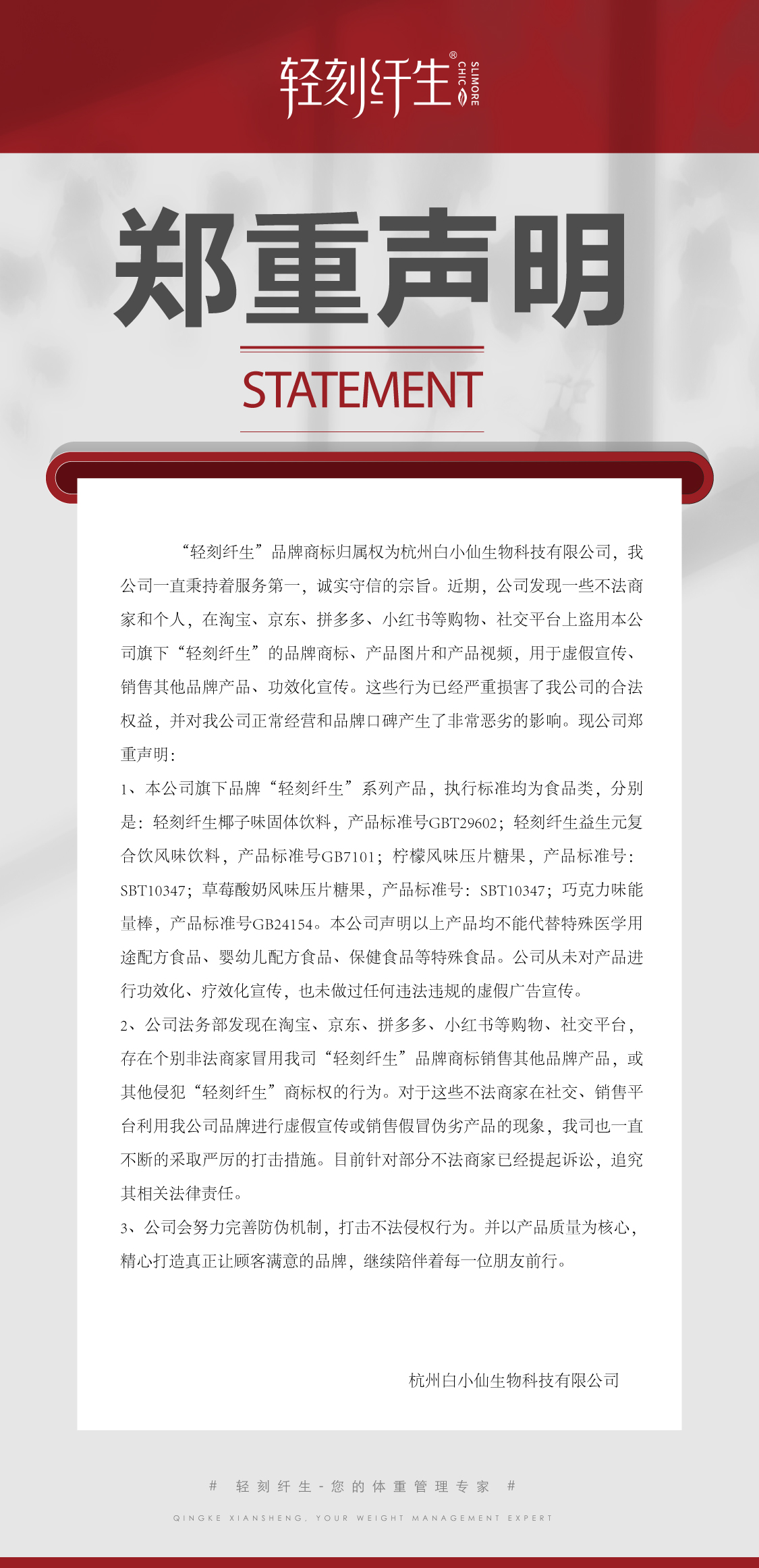 轻刻纤生品牌郑重声明